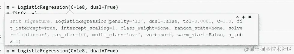 所以我们可以使用内置在 sklearn 的 LogisticRegression 类中的正则化,它使用的参数是C。这有点奇怪,较小的参数表示更多的正则化。这就是为什么我使用1e8基本上关闭了正则化。