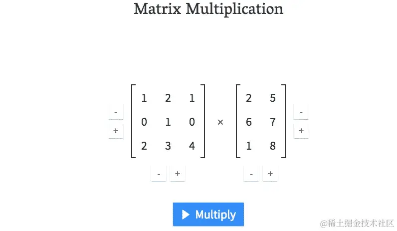 矩阵矩阵乘积看起来是这样的。有一个很棒的网站叫做matrixmultiplication.xyz,它向我们展示了当我们将两个矩阵相乘时会发生什么。从操作的角度来看,这就是矩阵乘法。换句话说,我们刚刚做的是首先取第一列和第一行相乘得到 15: