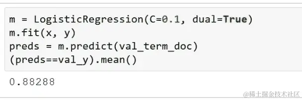 这是二值化版本[1:32:20]。差不多一样。所以你可以看到我用术语文档矩阵的符号进行了拟合,并用val_term_doc.sign()进行了预测。