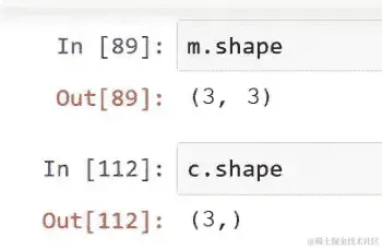 现在将其视为我们的矩阵。要让 numpy 这样做,我们需要传入一个矩阵而不是一个向量,而是传入一个具有一列的矩阵(即秩 2 张量)。基本上,numpy 会将这个秩 1 张量视为秩 2 张量,表示一行。换句话说,它是 1 乘 3。所以我们想要创建一个 3 乘 1 的张量。有几种方法可以做到这一点。一种方法是使用np.expand_dims(c,1),如果你传入这个参数,它会说“请在这里插入一个长度为 1 的轴”。所以在我们的情况下,我们想将其转换为 3 乘 1,所以如果我们说expand_dims(c,1),它会将形状改变为(3, 1)。所以如果我们看看它是什么样子的,它看起来像一列。