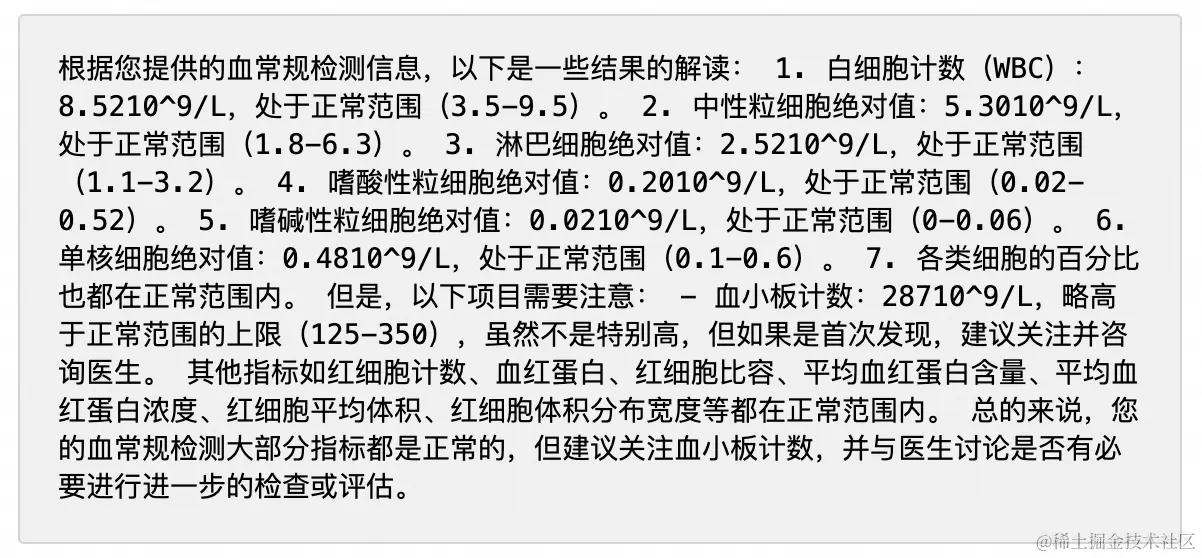 response = query_engine.query("在这份体检报告里,我的血常规检测有什么问题吗?")