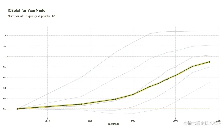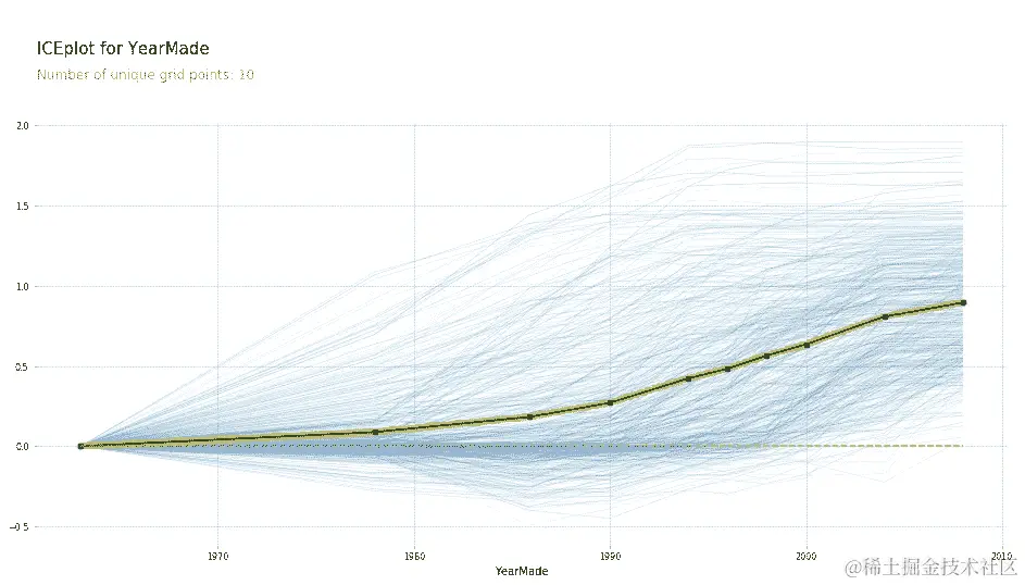 所以这里的部分依赖图(PDP)向我们展示的是每一条浅蓝色线实际上都显示了所有 500 条线。因此,对于我们数据集中的第 1 行,如果我们在 1960 年卖出它,我们将将其索引为零,称之为零。如果在 1970 年卖出那个特定的拍卖品,它将在这里,等等。我们实际上绘制了所有 500 个预测,即如果我们用不同的值替换其YearMade,那么这 500 个拍卖品中的每一个将会卖出多少钱。然后这条深色线是平均值。因此,这告诉我们,如果所有这些产品实际上是在 1985 年、1990 年、1993 年等制造的,我们将平均卖出这些拍卖品多少钱。因此,您可以看到,这里发生的情况是,至少在我们有相当多数据的时期,即自 1990 年以来,这基本上是一条完全直线,这是您所期望的。因为如果在同一日期卖出,而且是同一种拖拉机,卖给同一个人在同一个拍卖行,那么您会期望更近期的车辆更昂贵,因为通货膨胀和它们是更新的。您会期望这种关系大致是线性的,这正是我们发现的。通过消除所有这些外部因素,通常能够更清楚地看到真相。