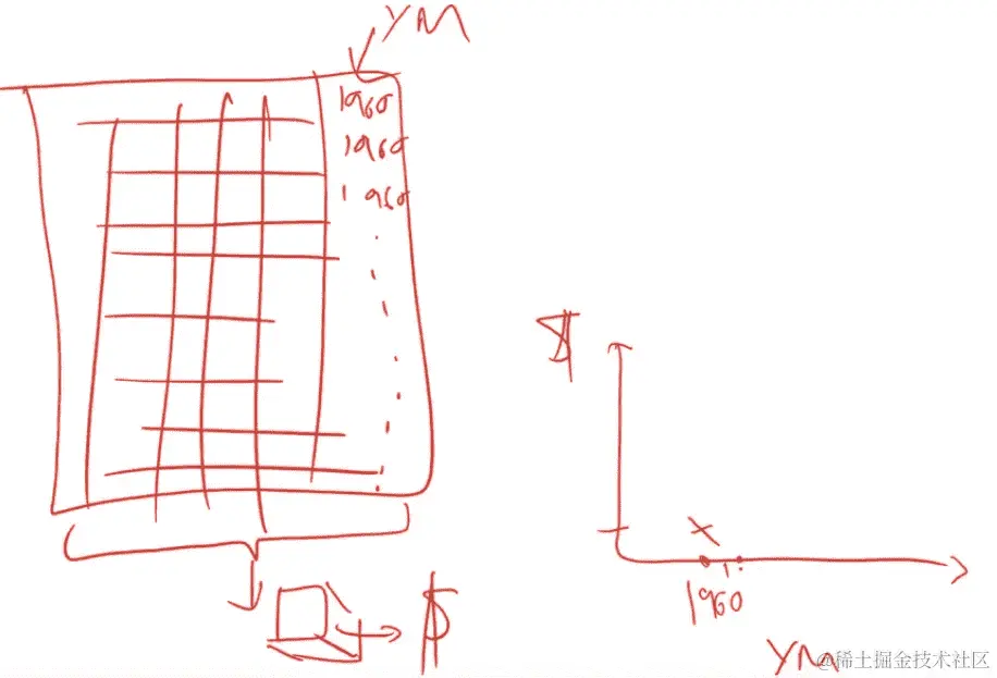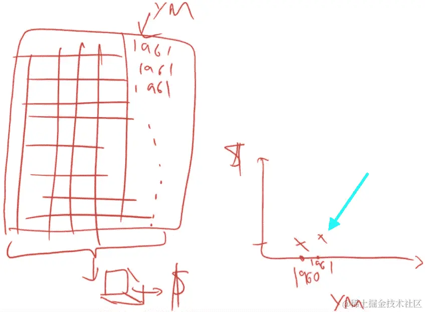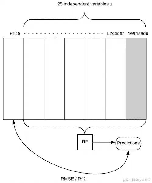这是我们的数据集,有 500 个拍卖品,这是我们的列,其中一个是我们感兴趣的事物YearMade。我们现在要尝试创建一个图表,在这个图表中我们说在 1960 年,其他所有事物都相等的情况下,拍卖品的成本是多少?我们将用 1960 年替换YearMade列。我们将一直复制值 1960,直到最后。现在每一行,制造年份都是 1960,所有其他数据都将完全相同。我们将使用我们的随机森林,将所有这些数据传递给我们的随机森林来预测销售价格。这将告诉我们,对于所有被拍卖的物品,如果那个物品是在 1960 年制造的,我们认为它将被卖出多少钱。这就是我们将在右侧绘制的内容。