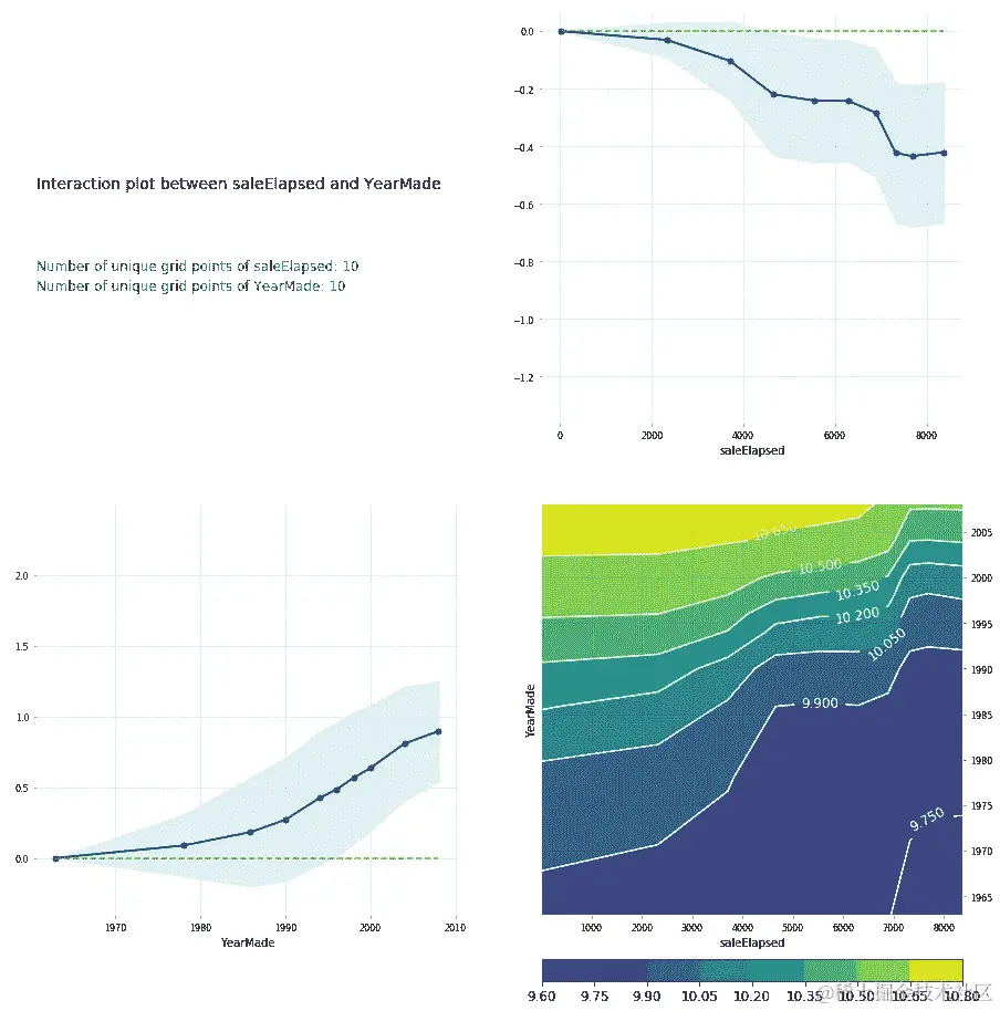 您也可以在 PDP 交互图中执行相同的操作[1:27:36]。而我真正想要的 PDP 交互图是,saleElapsed 和 YearMade 如何共同影响价格。如果我做一个 PDP 交互图,它会显示给我 saleElapsed vs. price,YearMade vs. price,以及两者的组合 vs. price。请记住,这里始终是价格的对数。这就是为什么这些价格看起来很奇怪。您可以看到 saleElapsed 和 YearMade 的组合正如您所期望的那样——价格最高的是那些经过的时间最短和最近制造的年份。右上角是 saleElapsed 和价格之间的单变量关系,左下角是 YearMade 和价格之间的单变量关系,右下角是两者的组合。足以清楚地看到这两个因素共同推动价格。您还可以看到这些不是简单的对角线,因此存在一些有趣的交互作用。根据观察这些图,我认为,也许我们应该加入某种交互项并看看会发生什么。所以让我们稍后再回到这个问题,但让我们先看几个例子。