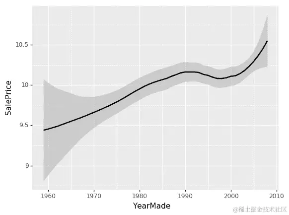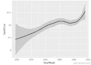 所以我只是从我的数据框中抓取 500 个点,然后绘制YearMade和SalePrice。aes代表“美学” - 这是你在ggplot中设置列的基本方式。然后在ggplot中有一个奇怪的东西,“+”表示添加图表元素。所以我要添加一个平滑线。通常你会发现散点图很难看清楚发生了什么,因为有太多的随机性。或者,平滑线基本上为图的每个小子集创建一个小线性回归。这样可以连接起来,让你看到一个漂亮的平滑曲线。这是我倾向于查看单变量关系的主要方式。通过添加se=True,它还会显示这个平滑线的置信区间。loess代表局部加权回归,这是做许多小型回归的想法。