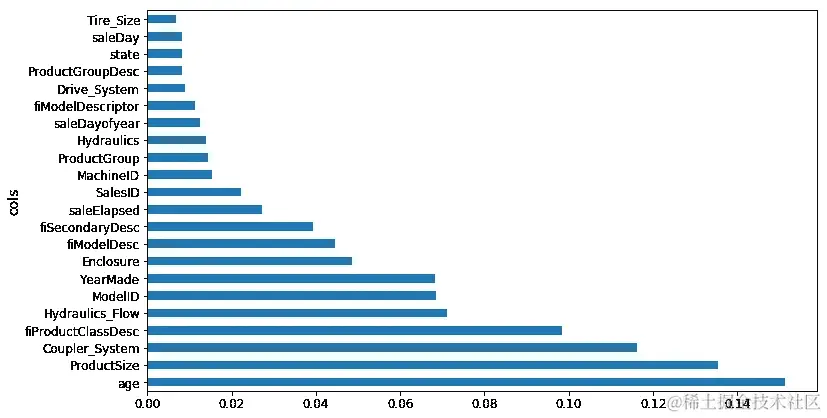 根据之前的交互分析,首先我尝试将 1950 年之前的所有内容设置为 1950 年,因为这似乎是某种缺失值[1:31:25]。我将age设置为saleYear - YearMade。然后我尝试在此基础上运行随机森林。确实,age现在是最重要的因素,saleElapsed 远远落后,YearMade 也落后。因此,我们使用这个找到了一个交互作用。但请记住,随机森林可以通过具有多个分割点来创建交互作用,因此我们不应该假设这实际上会带来更好的结果。实际上,当我查看我的得分和 RMSE 时,我发现添加 age 实际上效果稍差。也许在下一节课中我们会看到更多相关内容。