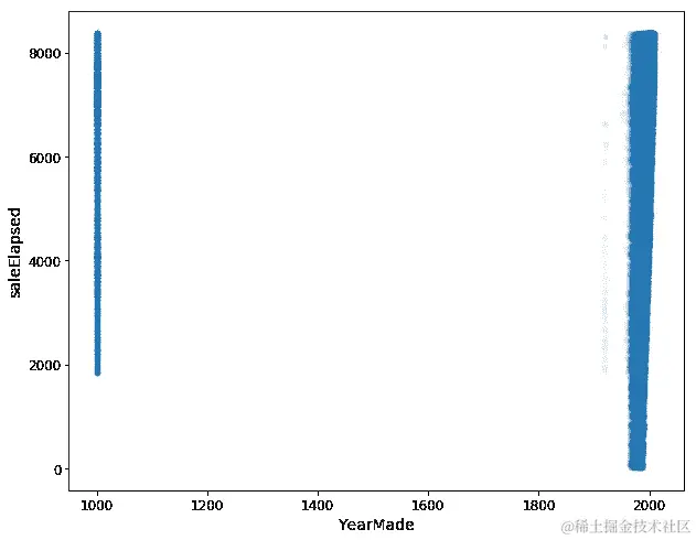 所以我们可以在这里看到,YearMade和SalePrice之间的关系非常混乱,这并不是我们所期望的。我本来以为最近卖出的东西可能会更贵,因为通货膨胀和更现代的型号。问题在于,当你看一个像这样的单变量关系时,会有很多共线性发生 - 很多互动被忽略了。例如,价格为什么会下降?是因为 1991 年至 1997 年之间制造的东西价值更低吗?还是因为大部分产品在那个时期也被卖出,那时可能有经济衰退?或者是因为在那个时期卖出的产品,更多人购买了价格更低的车辆类型?有各种各样的原因。所以再次,作为数据科学家,你将会看到的一件事是,在你加入的公司里,人们会拿着这种单变量图来找你,他们会说“哦天啊,我们在芝加哥的销售量消失了。变得很糟糕。”或者“人们不再点击这个广告了”,然后他们会给你看一个看起来像这样的图表,问发生了什么。大多数情况下,你会发现答案是“发生了什么”的问题是有其他原因的。比如,“实际上上周在芝加哥,我们在做一个新的促销活动,这就是为什么我们的收入下降了 - 不是因为人们不再在芝加哥购买东西了;价格更低了”。