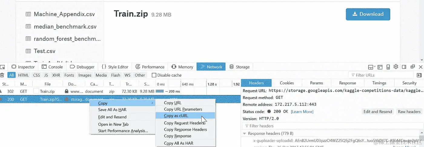 ctrl + shift + i打开 Web 开发者工具。转到Network选项卡,点击Download按钮,然后取消对话框。它会显示已启动的网络连接。然后右键单击它,选择Copy as cURL。粘贴命令并在末尾添加-o bulldozer.zip(可能删除 cURL 命令中的— — 2.0)