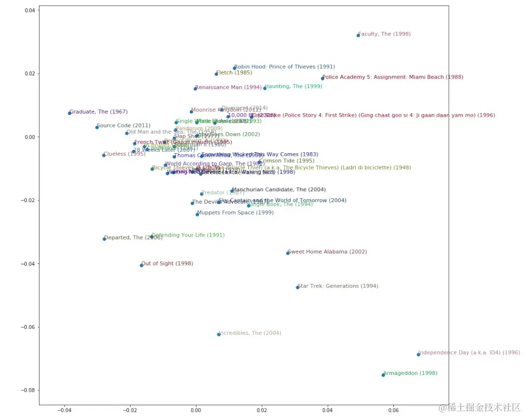 每部电影有 50 个嵌入,很难可视化 50 维空间,所以我们将其转换为三维空间。我们可以使用几种技术来压缩维度:主成分分析(PCA)(Rachel 的计算线性代数课程详细介绍了这一点——几乎与奇异值分解(SVD)相同)