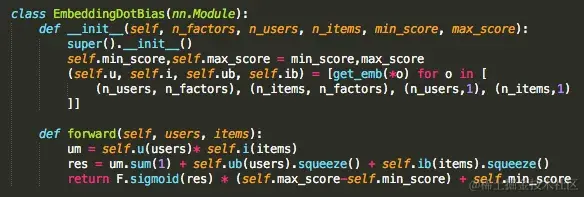 m.ib指的是一个项目偏差的嵌入层--在我们的例子中是电影偏差。PyTorch 模型和层的好处是我们可以像调用函数一样调用它们。所以如果你想得到一个预测,你调用m(...)并传入变量。