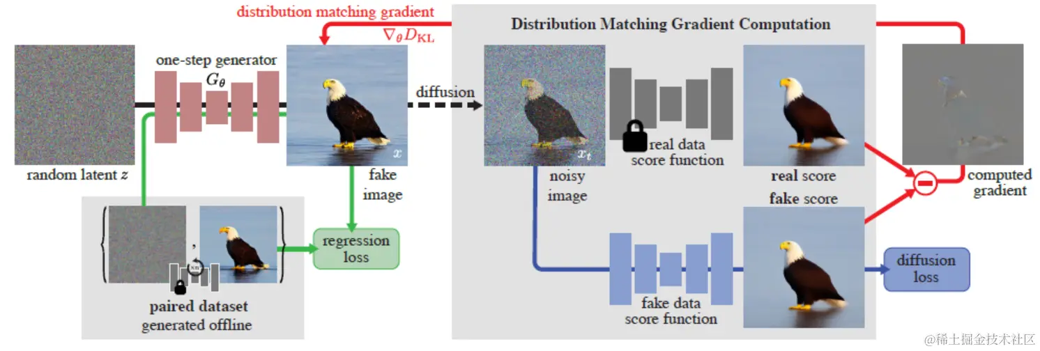 分布匹配蒸馏(Distribution Matching Distillation,简称DMD)的目标是将给定的预训练扩散去噪器(基模型)转化为能够快速生成高质量图像的“一步”图像生成器,而不需要耗时的迭代采样过程。这一过程包括两个主要部分:预训练基模型与一步生成器的构建,以及分布匹配损失的定义。