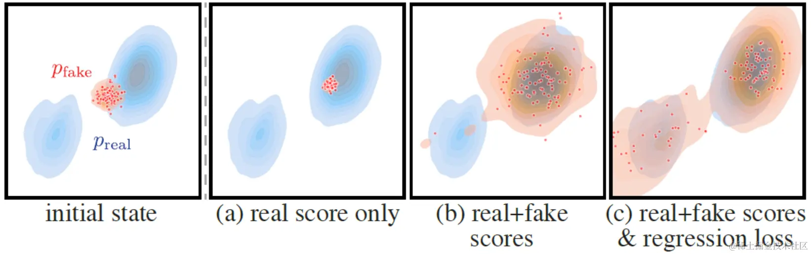该图展示了从相同的初始配置(左图)优化不同目标函数所导致的不同结果: (a) 只有真实得分: 当只优化真实得分时,生成的假样本都聚集在真实分布的最近模式上,出现了模式坍塌现象,即只能捕捉到数据的一部分特征。 (b) 真实得分+假得分: 当考虑了真实和假分布的得分,但没有回归损失时,生成的假数据覆盖了更多的真实分布,但仍然完全错过了第二个模式,即没有捕捉到分布的全部特征。 (c) 真实得分+假得分+回归损失: 当全面考虑真实得分、假得分以及回归损失时,完整的目标函数能够恢复目标分布的所有模式,生成的数据不仅多样且质量高。 这三个子图说明了不同优化策略对生成模型性能的影响,强调了在生成过程中同时考虑多个目标的重要性,以确保生成的数据既真实又多样。这一点在使用生成模型进行数据增强或者模拟真实世界分布时尤为重要。