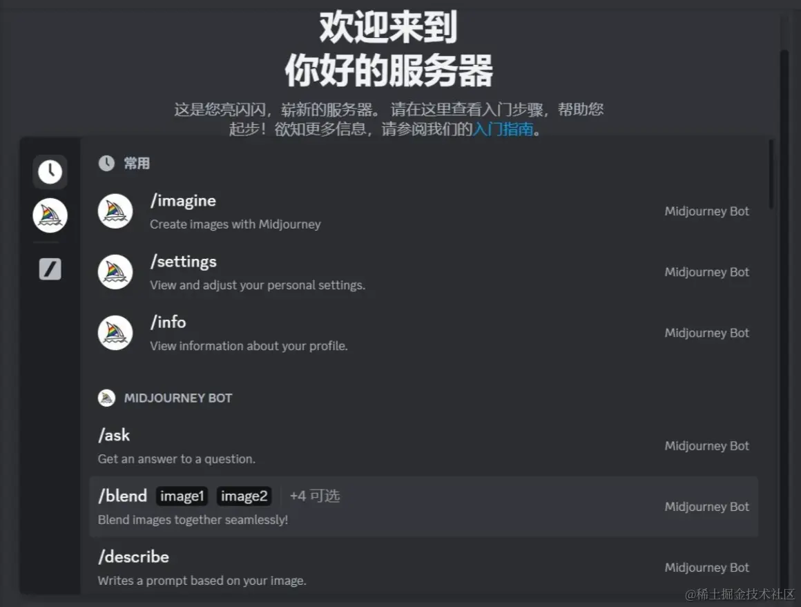 到这里我们终于可以开始AI绘画了,在自己的服务器界面中可以看到页面底部有一个输入框。这是我们与Midjourney沟通的聊天输入窗口,我们所有的命令都从这里发送给Midjourney机器人。