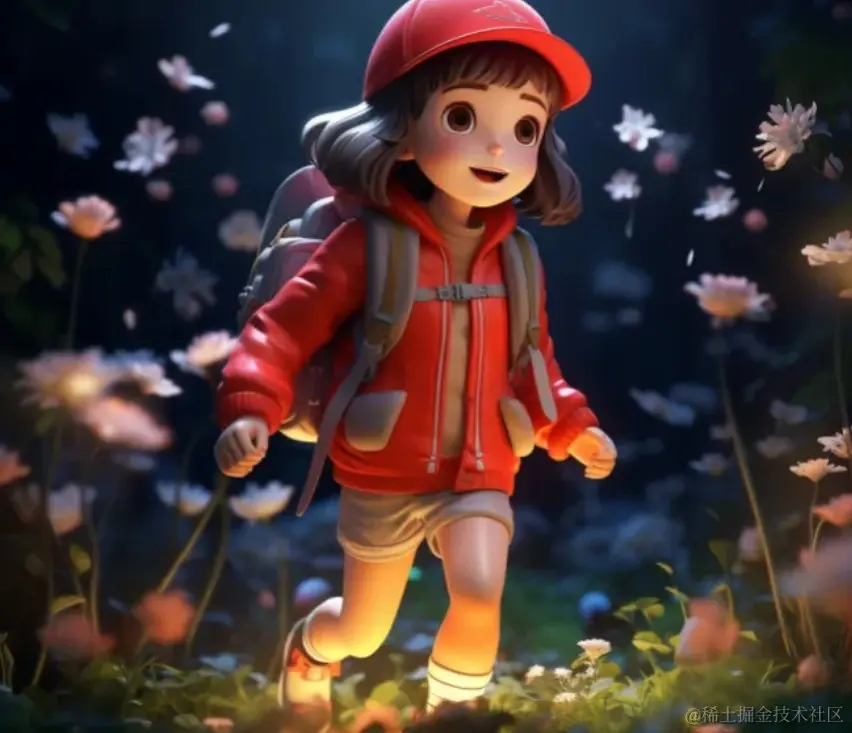 A very cute girl in a red flight jacket and bucket hat,full body,running in the forest at night,mystery adventure,flowers,plants,fireflies,intricate details,popmart blind box,claymaterial,pixar trends,3d art,c4d,Octane Rendering,Animated Lighting,Uplighting
