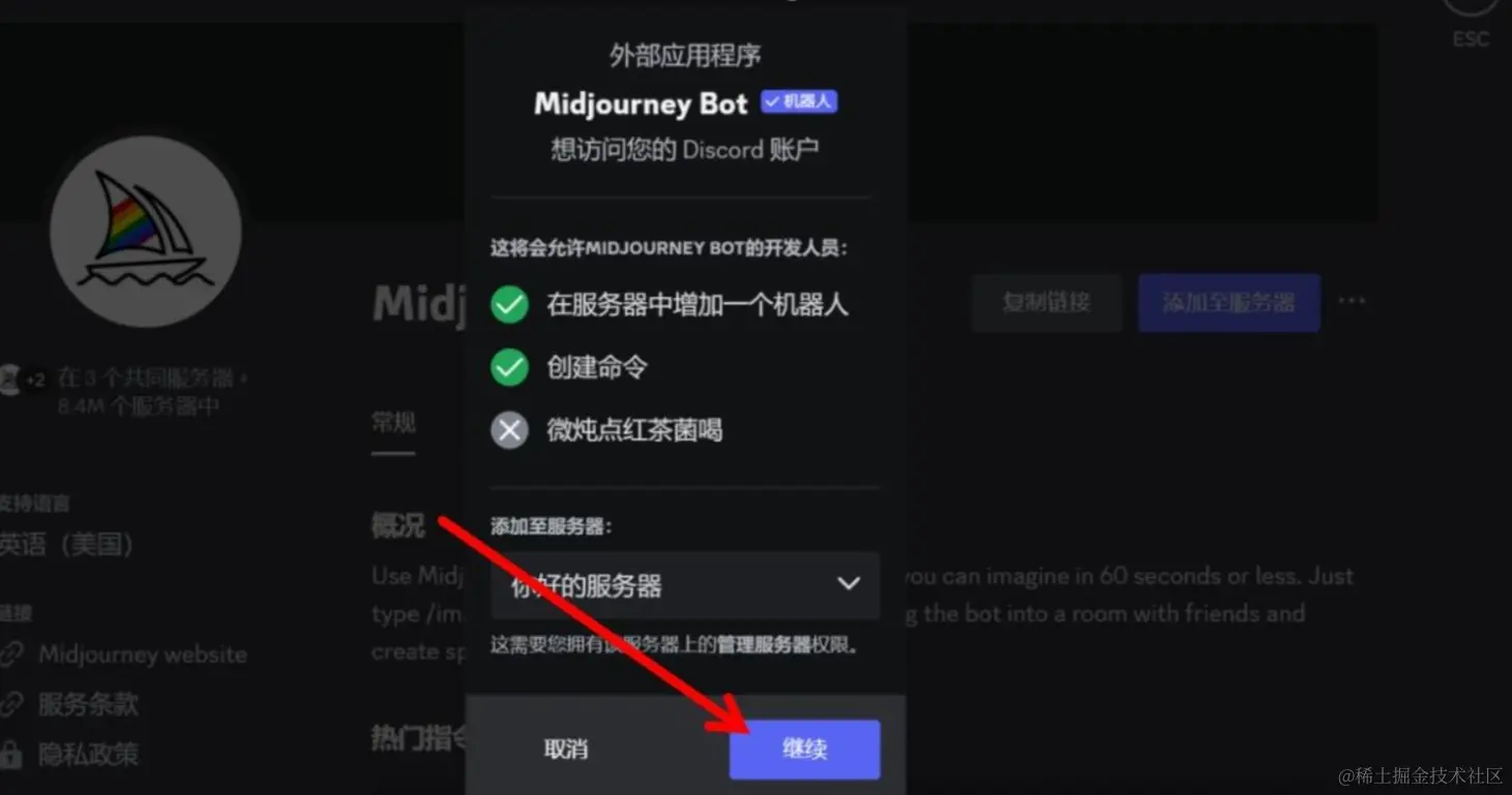 选择“自己的服务器”,依次点击“继续”、“授权”、“我是人类(机器人识别…)”,将"Midjourney”添加到自己的服务器。