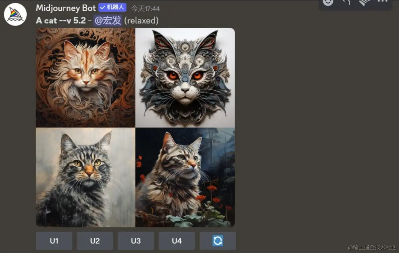 3、稍等一会,midjourney机器人会反馈给你一个四宫格的图片,里面是根据你的关键词生成的四张图像。你可以在这四张的基础上进行更细致化的生成或者重新生成。