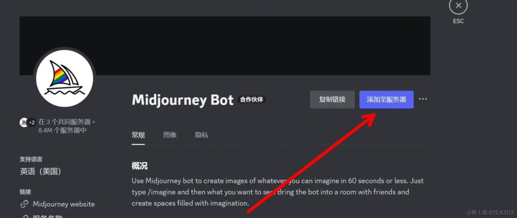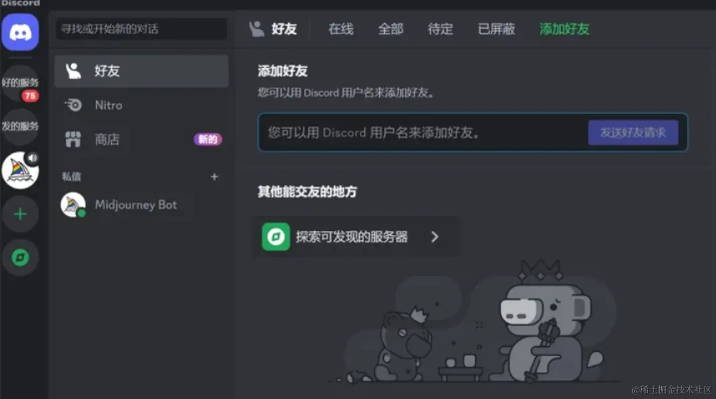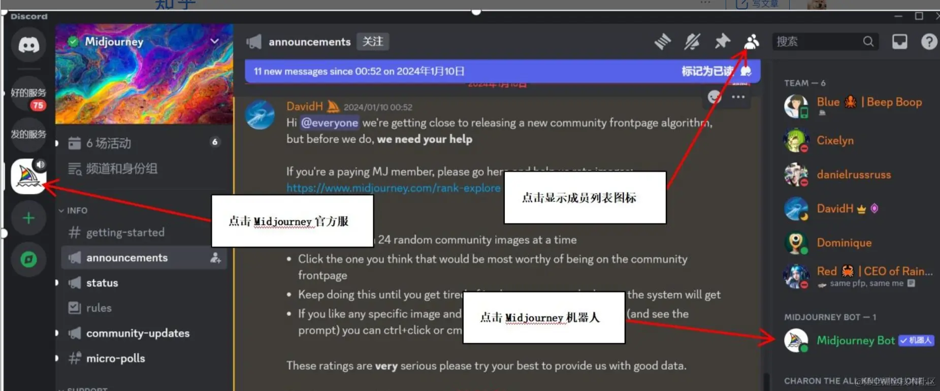 新建了服务器是无法直接使用的,还需要把Midjourney的机器人添加到你的服务器里面来。进入"Midjourney”官方服务器(帆船图标服务器,非自己新建的服务器),选择一个"newbies-(数字)”的房间,点击“显示成员列表”图标显示右侧成员列表,点击"Midjourney"机器人