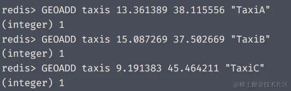 使用 GEOADD 命令记录出租车坐标位置。在这个例子中,我们使用了经度和纬度的虚构值。