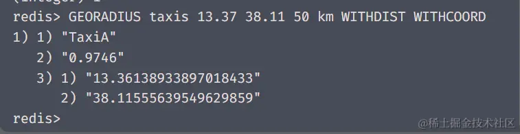 127.0.0.1:6379> GEORADIUS taxis 13.37 38.11 50 km WITHDIST WITHCOORD