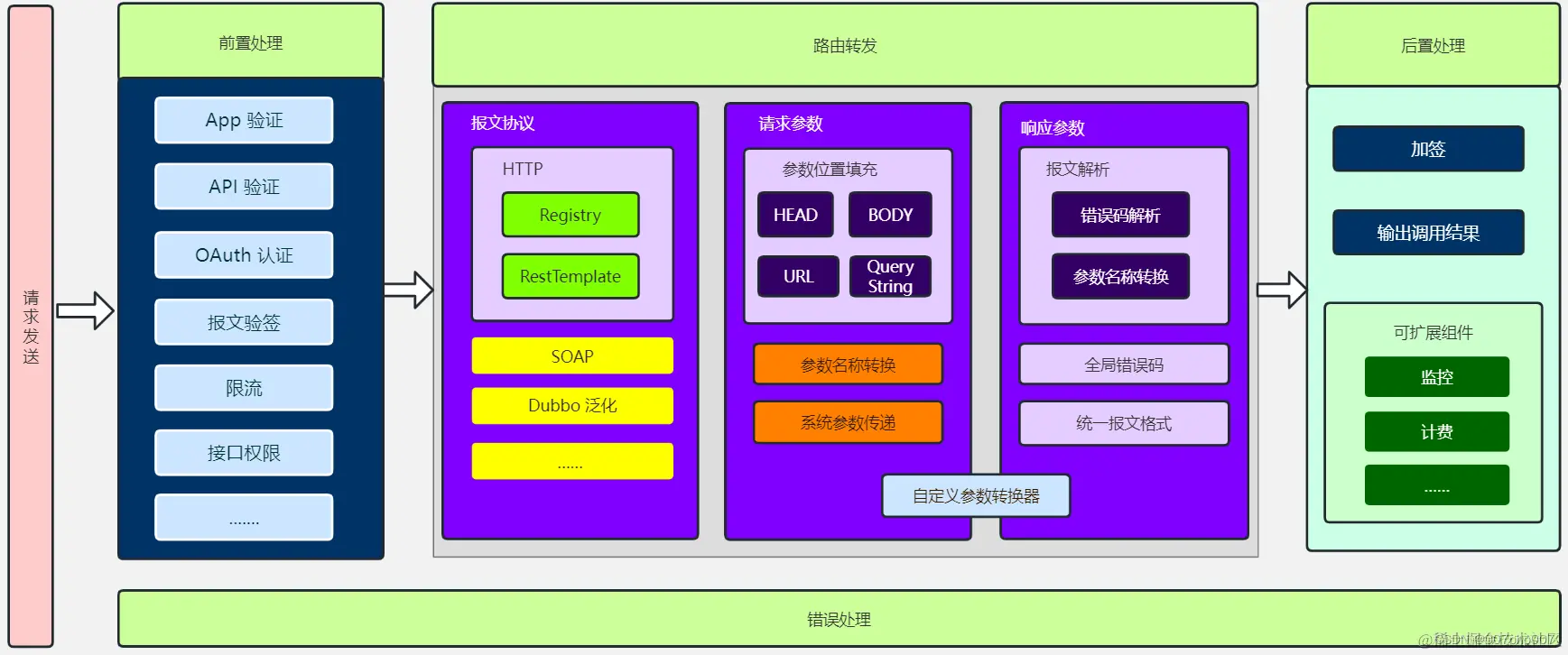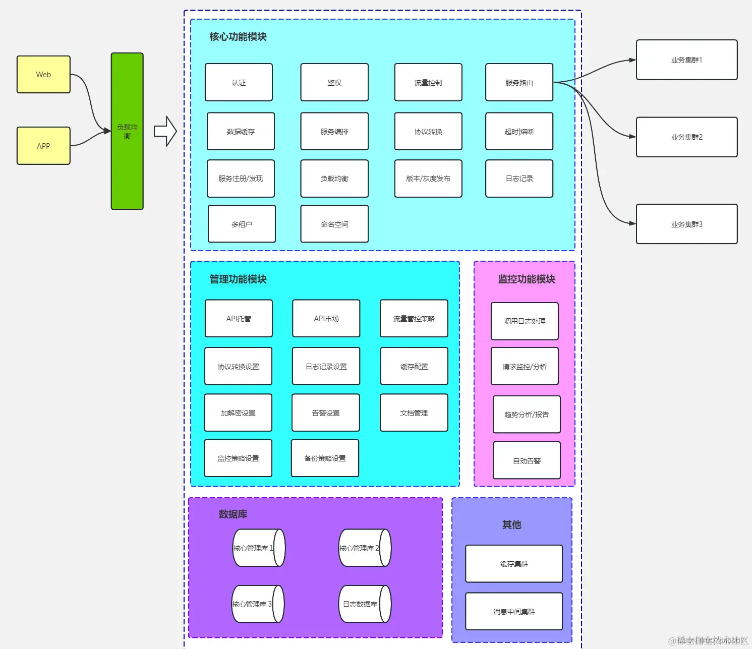 - 介绍了API网关的核心功能和特性,包括请求路由、负载均衡、请求转发、协议转换、安全认证和授权、监控和日志等。 -