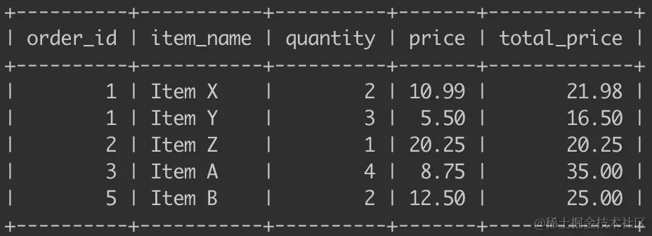 SELECT order_id, item_name, quantity, price, quantity * price AS total_price FROM orderitems;