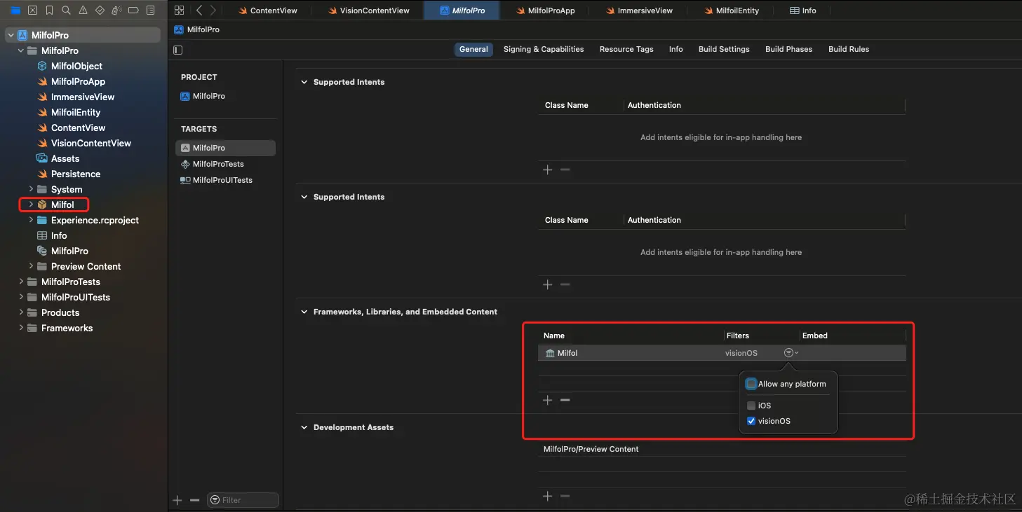 首先在,Targets -> Frameworks, Labraries...中添加该RealityComposerPro项目