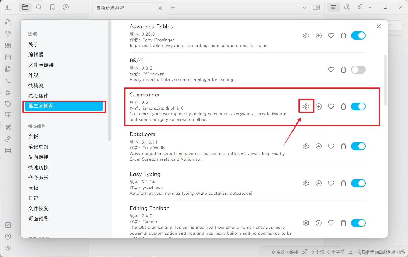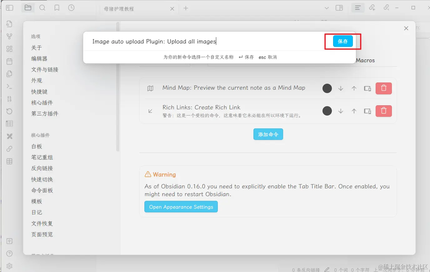 Image auto upload 就是用来结合 PicGO 来实现一键上传图床的插件。而 Commander 是用来实现“一键”这个功能的,也就是它能将这个功能显示在界面上为一个按钮。