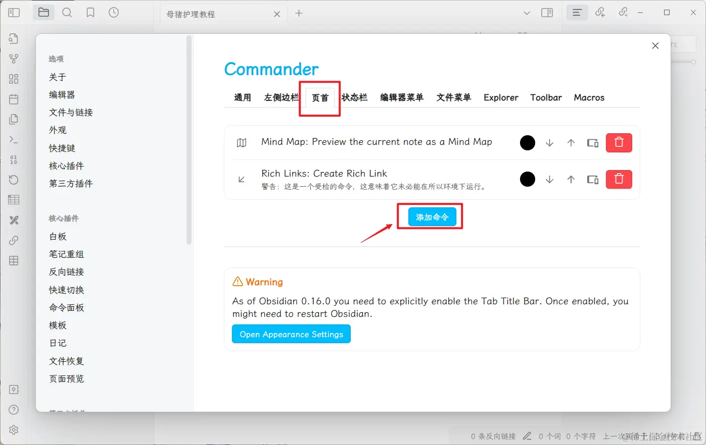 由于 Obsidian 默认是不能自定义按钮,所以需要 Commander 为 Obsidian 四周添加一些按钮,跟 IDEA 上的调试、运行按钮一样。