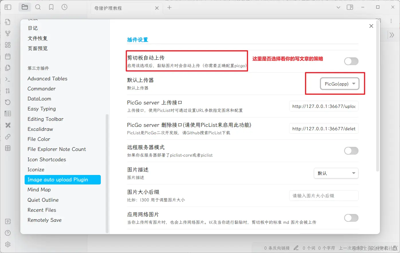 这里假设你已经看了文章顶部链接的文章,并且已经创建了自己的图床,并配置了“PicGO”。