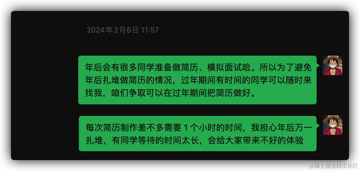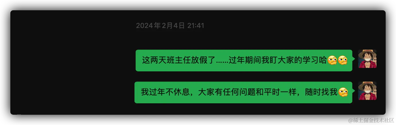 因为我主要做 前端私教训练营,同时 3、4 月份属于招聘旺季,为了保证同学在年后都可以找到满意的工作。所以,哪怕是在年假期间,我也需要时刻关注到每位同学的学习情况,并且时刻帮助大家解决对应的问题。