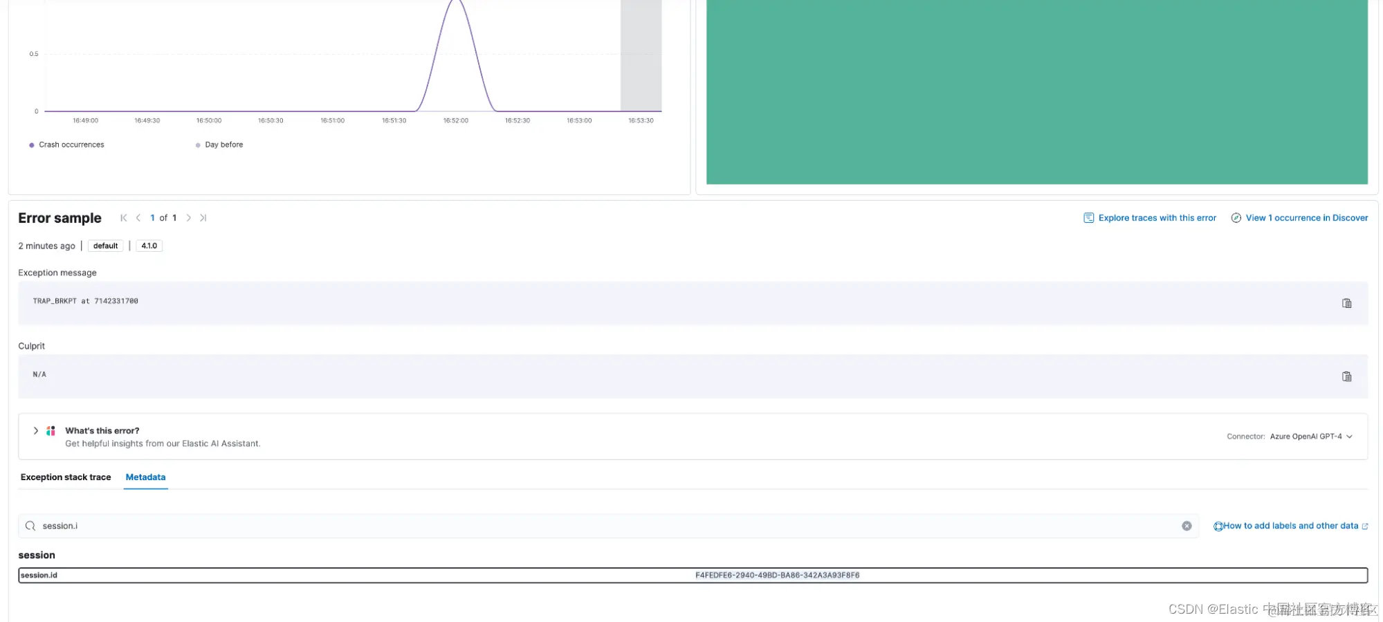 时间线中彼此相邻的崩溃和 breadcrumb 可能来自完全不同的设备,因此我们需要另一个区分器。 对于每次崩溃,我们都有包含与崩溃关联的 session.id 的元数据,可以从 “Metadata” 选项卡查看。 我们可以使用此 session.id 进行查询,以确保我们在 Discover 中查看的唯一数据来自导致崩溃的单个用户会话(即单个设备)。