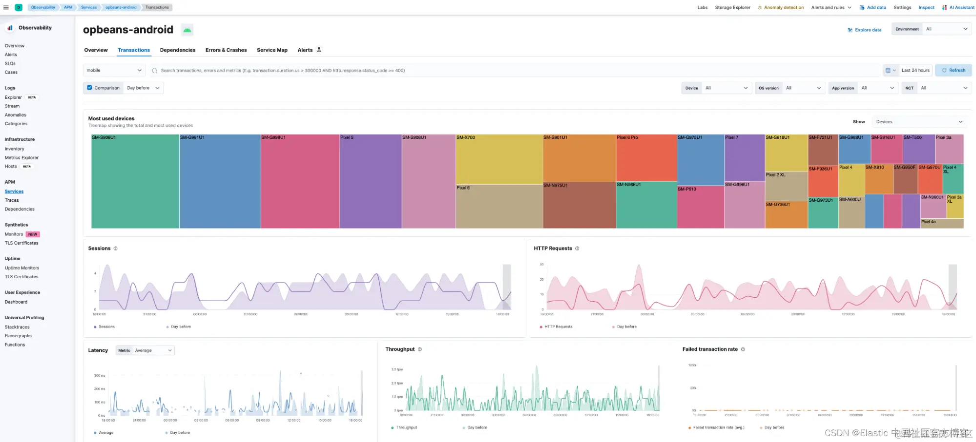 下面显示的事务视图突出显示了不同事务组的性能,包括各个 transaction 的端到端分布式跟踪以及关联跨度、错误和崩溃的链接。 此外,用户可以一目了然地看到按设备品牌和型号、应用程序版本和操作系统版本划分的流量分布情况。