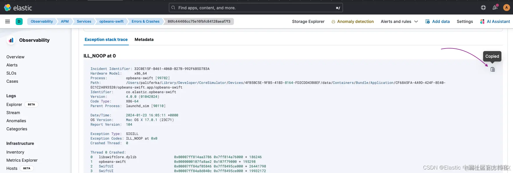 - 通过 UI 复制崩溃并将其粘贴到具有以下名称格式 , 例如,_. For example, “opbeans-swift_2024-01-18-114211.ips。