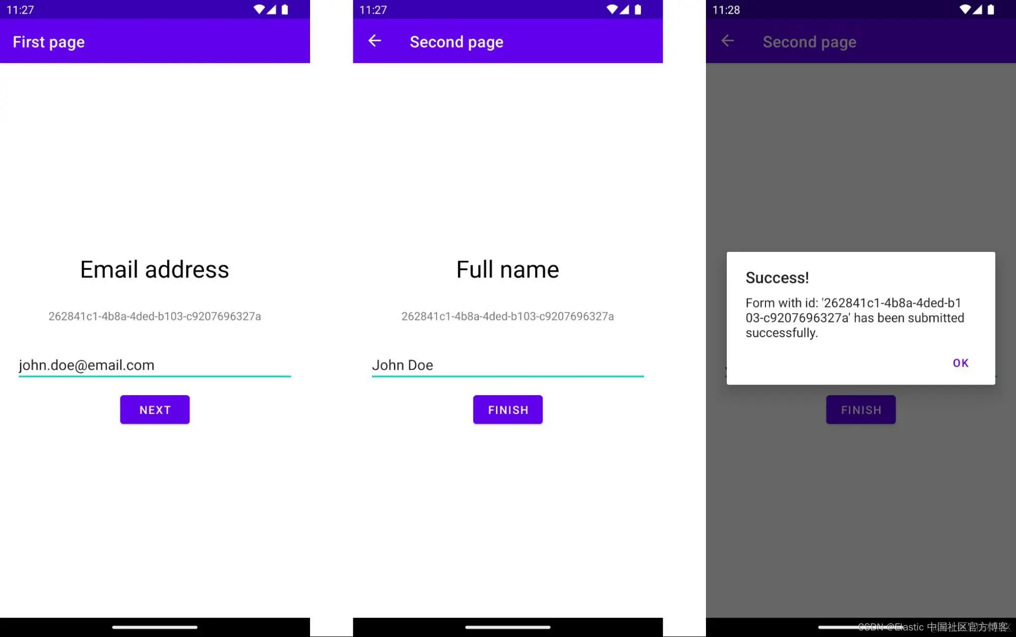 Android 示例应用程序有一个由两个屏幕组成的表单,这两个屏幕是使用两个片段(“FirstPage” 和 “SecondPage”)创建的。 在第一个屏幕中,应用程序进行后端 API 调用以获取标识表单提交的密钥。 该密钥存储在应用程序的内存中,并且必须在发送表单的最后一个屏幕上可用; 密钥必须与表单数据一起发送。