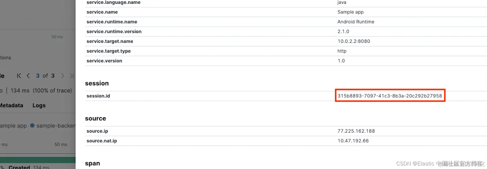 另一种选择可能是查看发生崩溃的应用程序中整个会话期间发送的日志(我们也可以查看来自我们应用程序的所有日志,但它们太多,无法分析这一问题)。 为此,我们首先复制一个跨度的 “session.id” 值(任何 span 都可以工作,因为在崩溃发生期间从我们的应用程序发送的所有数据中都可以使用相同的会话 ID) 在跨度详细信息弹出窗口中。