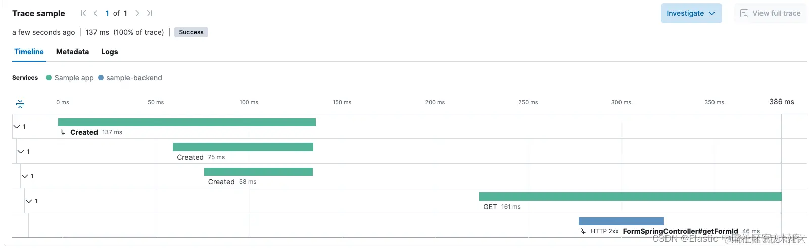 "Created” span 表示创建第一个片段所花费的时间。 最上面的显示了 Activity 创建,然后是 NavHostFragment,最后是 “FirstScreen”。 创建后不久,我们看到向后端发出了 GET HTTP 请求来检索表单 ID,并且根据跟踪,GET 请求成功。 因此,我们可以排除该问题是后端通信存在问题。