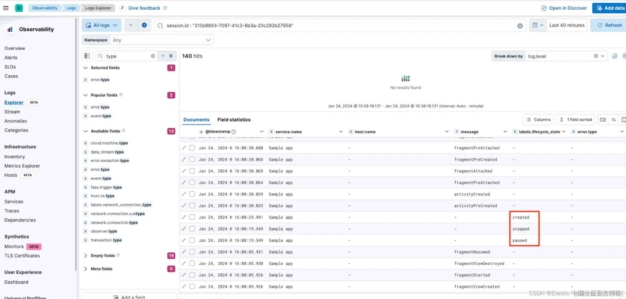 通过查看日志并添加一些字段来显示应用程序的生命周期状态和错误类型,我们可以看到从应用程序自动收集的日志事件。 我们可以看到列表顶部的崩溃事件是最新的。 我们还可以看到应用程序的生命周期事件,如果继续滚动,我们将看到一些生命周期事件,这些事件将有助于找到根本原因:
