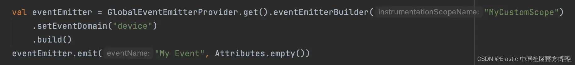 额外的好处:对于这个场景,我们依靠 APM 代理自动发送的事件就足够了; 但是,如果这些对于其他情况还不够,我们始终可以通过 OpenTelemetry 事件 API 在想要跟踪应用程序状态更改的位置发送自定义事件,如下面的代码片段所示: