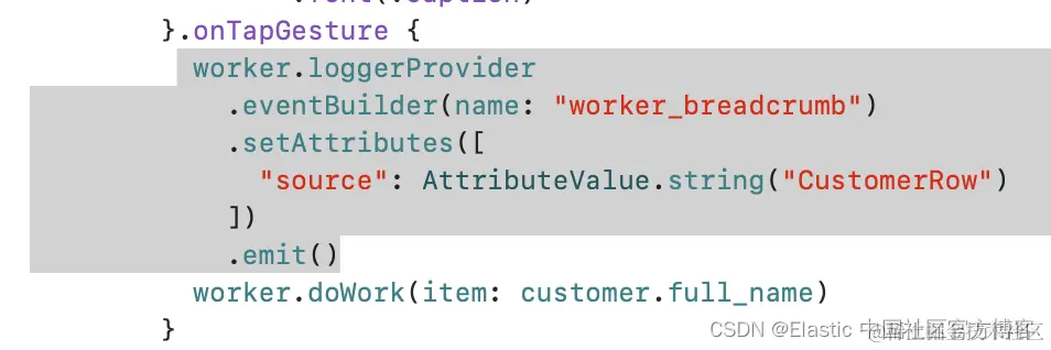 在此示例中,Worker.doWork() 函数是从 CustomerRow 结构(执行 “onTapGesture” 的表行)调用的。 如果你要从 CustomerRow 结构中的多个位置调用此方法,你还可以向 “source” 属性值添加其他区别,例如关联函数(例如 “CustomerRow#onTapGesture”)。