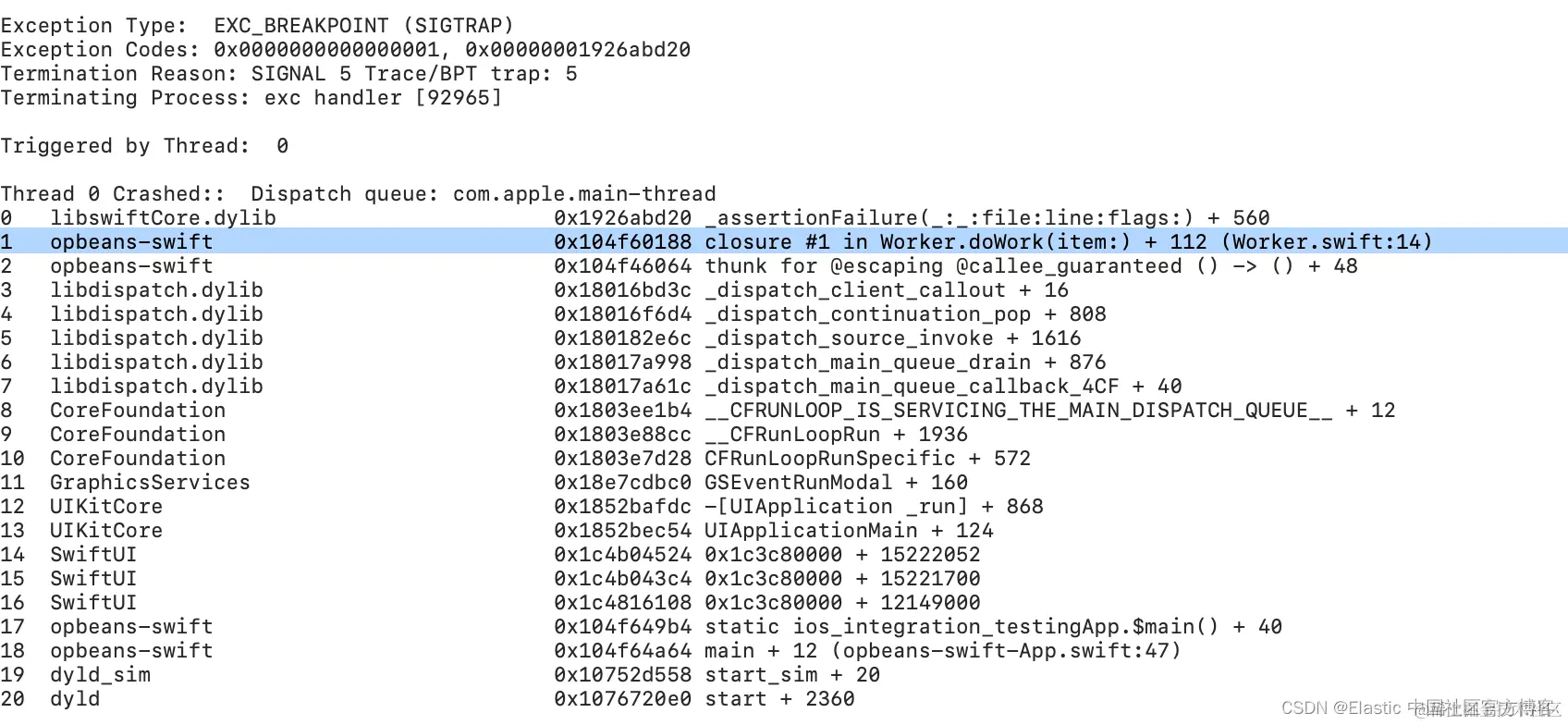 第一个线程的第二帧显示崩溃发生在 Worker 实例中。