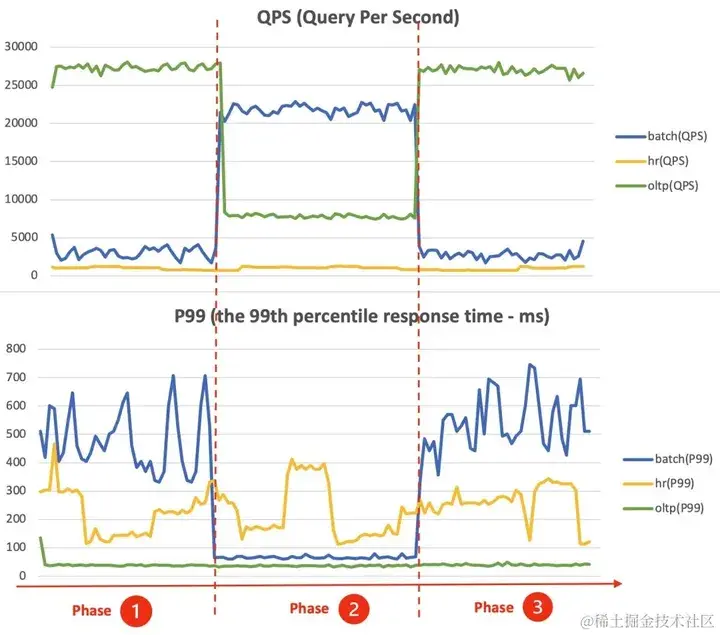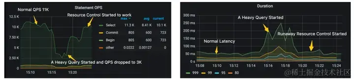 譬如在 7.5 里面,我们花了大量的经历仍然去完善和优化 resource control,譬如我们引入了 runaway query 机制,给用户提供了对于 heavy query 的控制机制,更好的防止了一些突发 heavy query 引起的 TP 业务抖动问题,效果如下: