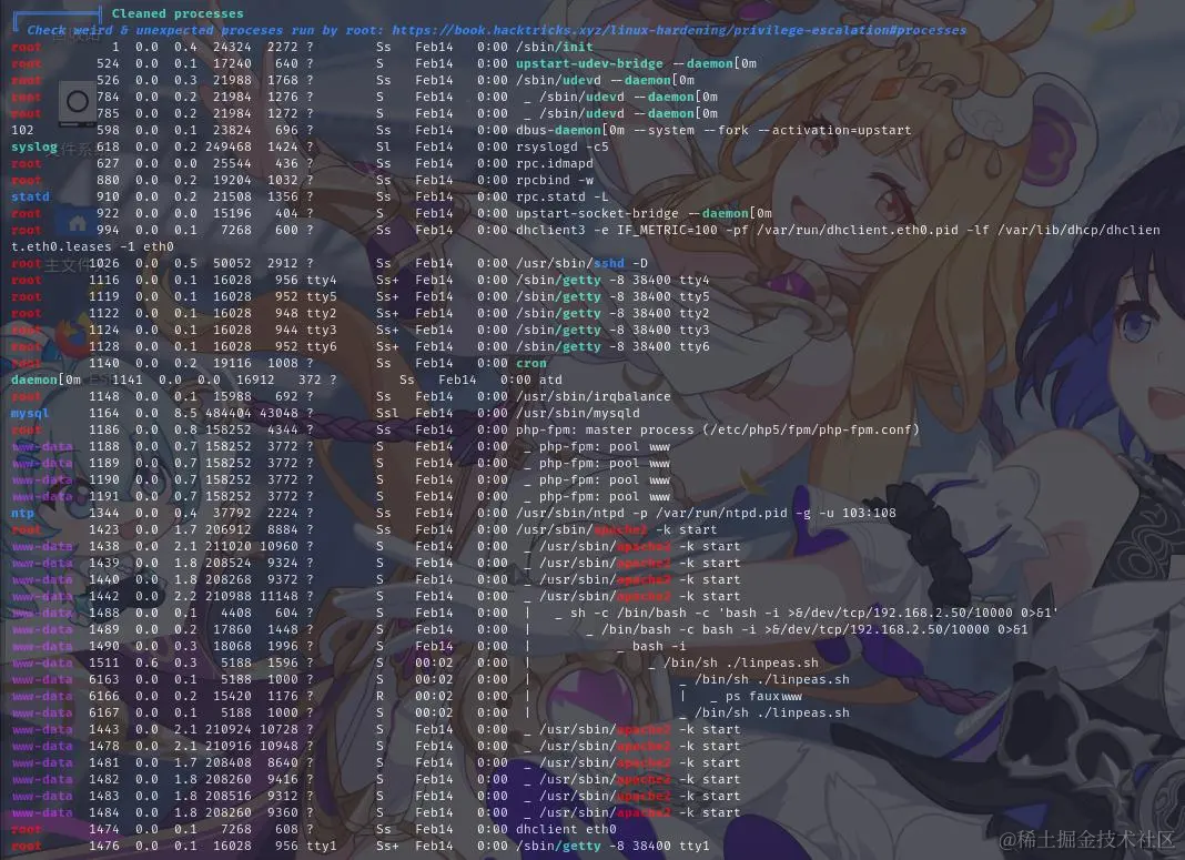 成功进入系统之后,我们在攻击机的8000端口开启SimpleHTTPServer,上传LinPeas工具进行信息收集: