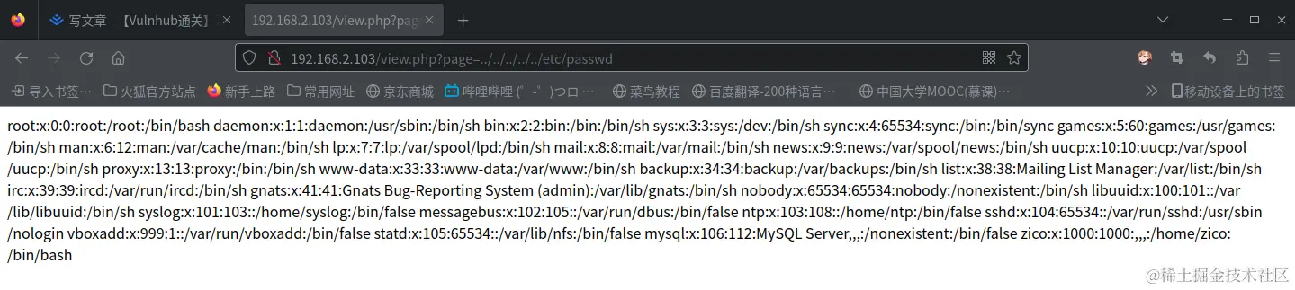 尝试将view.php的GET参数page改为../../../../../etc/passwd,成功,确定此处存在任意文件包含漏洞: