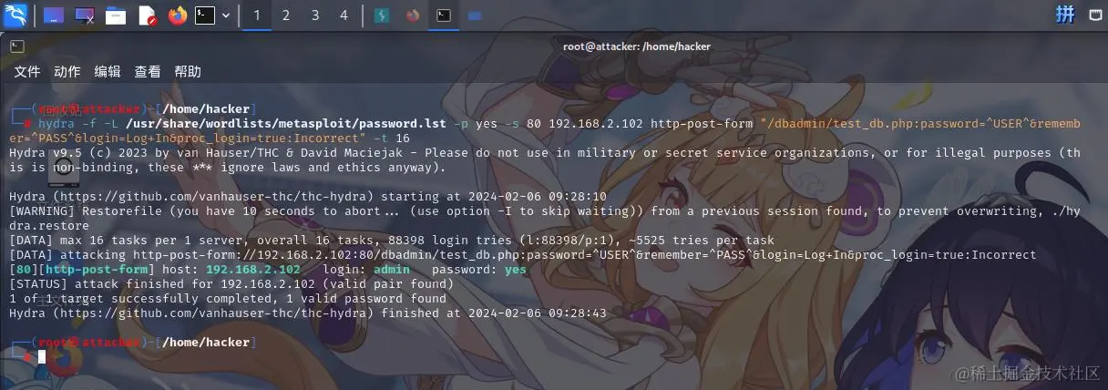 其中password参数为我们输入的密码。这里确定路由之后直接使用hydra爆破: