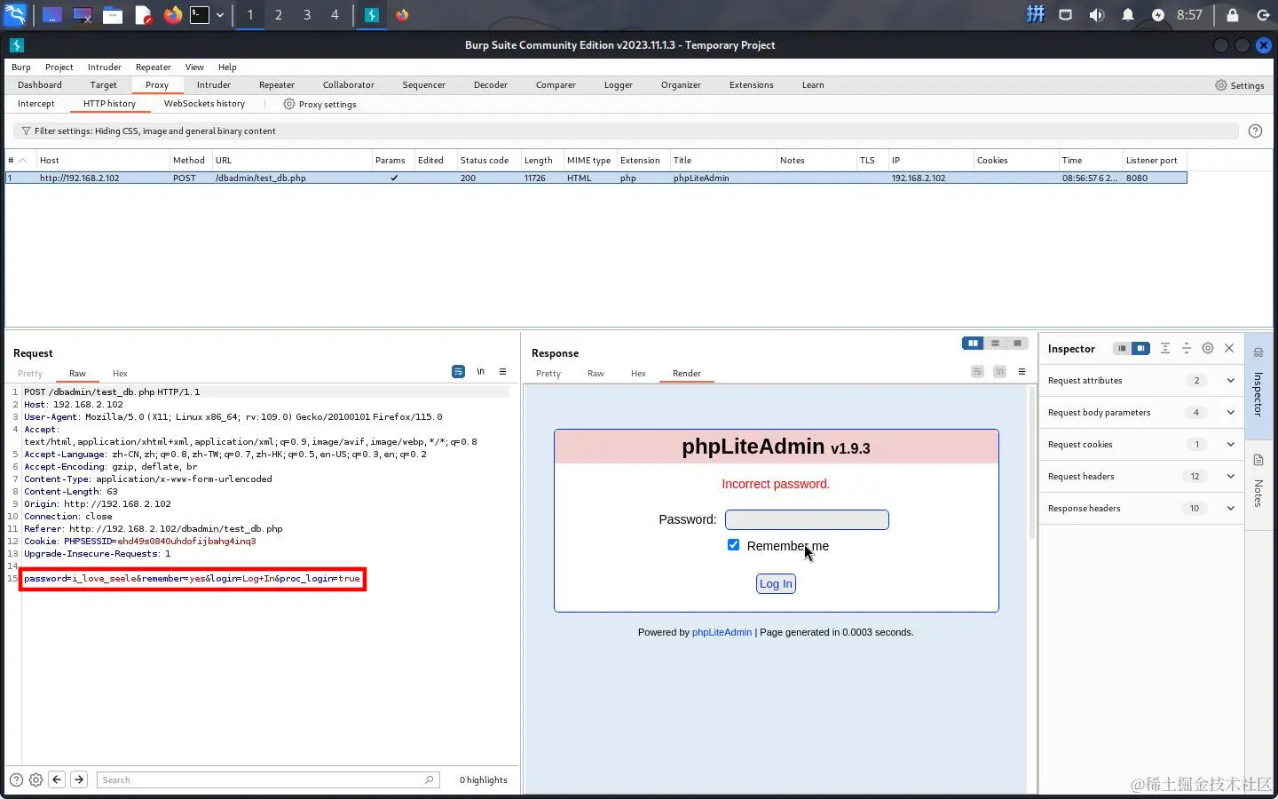 在Kali Linux中,我们使用Hydra工具对其进行密码爆破。首先我们使用BurpSuite工具对登录请求包进行拦截查看,确定路由: