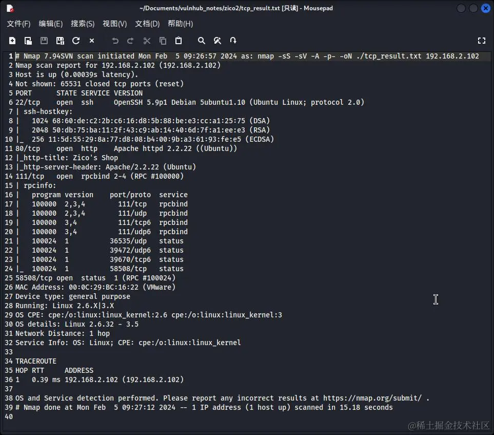 同时发现靶机操作系统为Ubuntu Linux,内核版本为Linux 2.6.32 - 3.5。