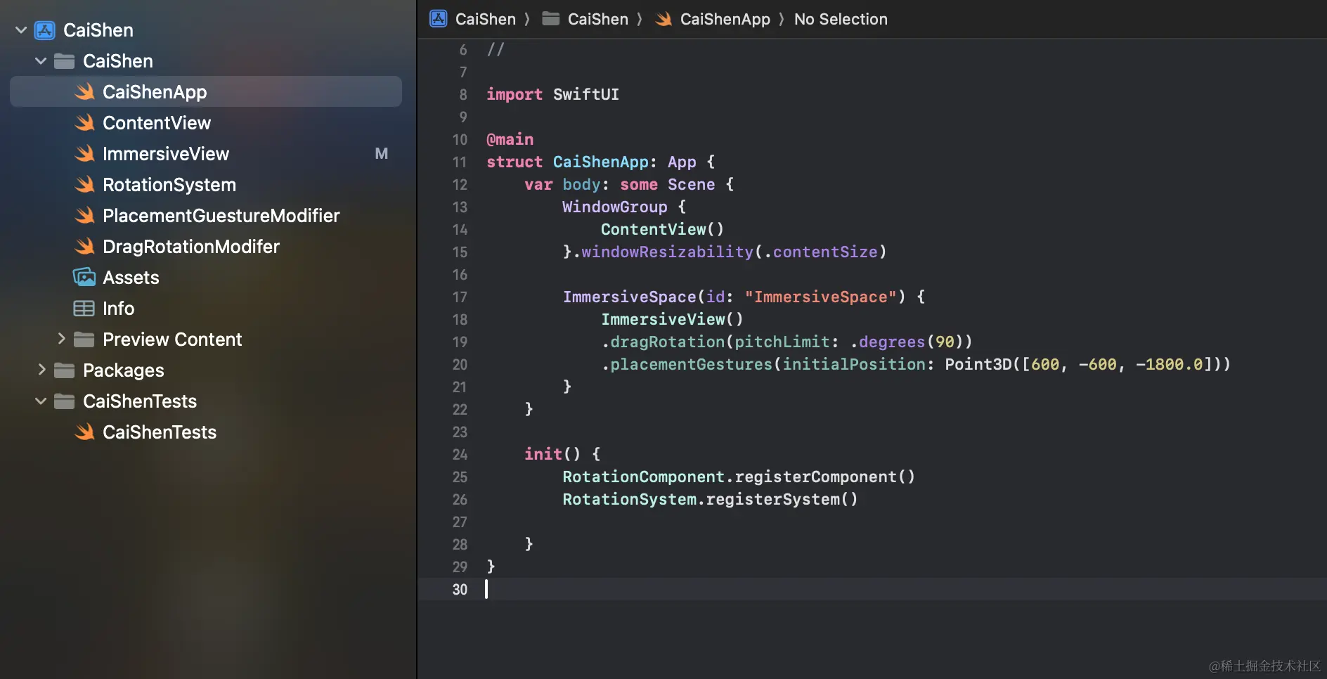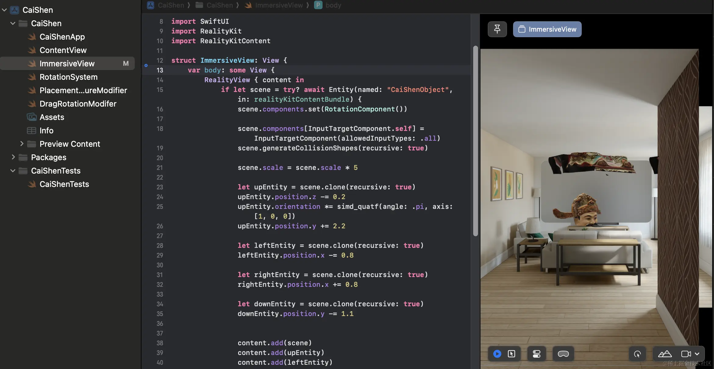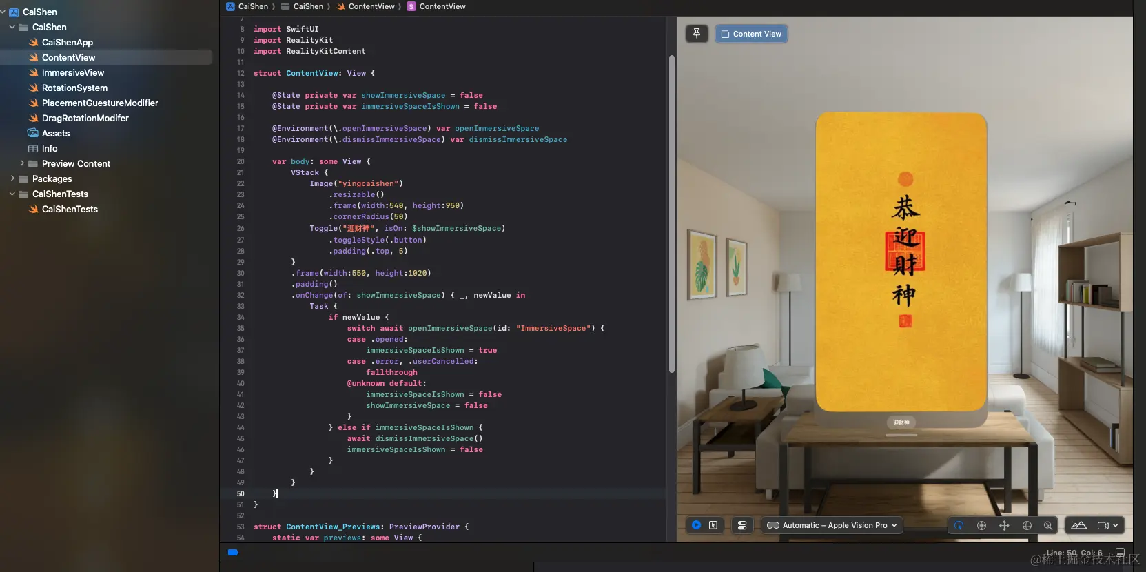 教程的第三篇文章拖的有点久了,以致于过年期间做了一个更精简的Demo《迎财神》,那么我就基于这个Demo来讲解一下ImmersiveSpace和3D手势吧。 可以先看一下视频: www.bilibili.com/video/BV1FK…