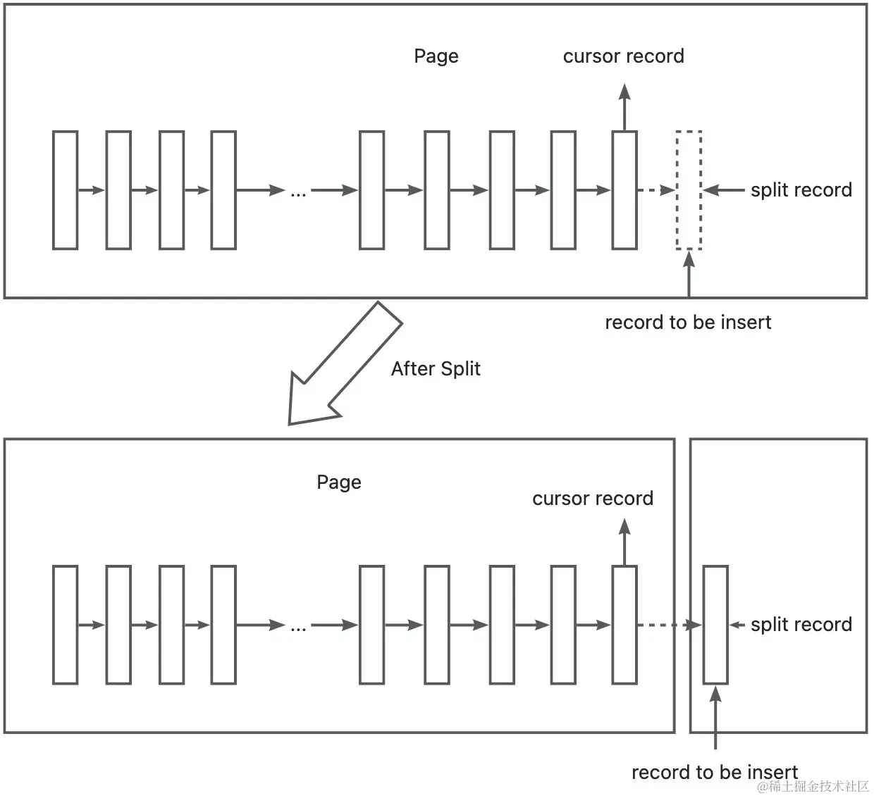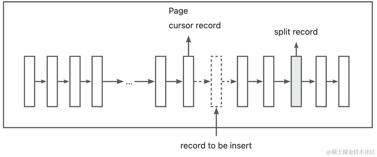 上图向右分裂且定位到的记录之后还有 3 条记录,split record 为分裂点记录最终向右分裂的到如下图所示的情况: