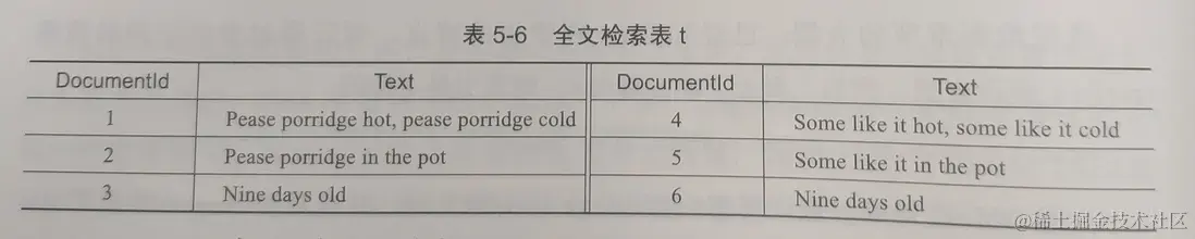 对于下图所示的数据来说(DocumentId 表示进行全文检索文档的 Id,Text 表示存储的内容),示例如下: